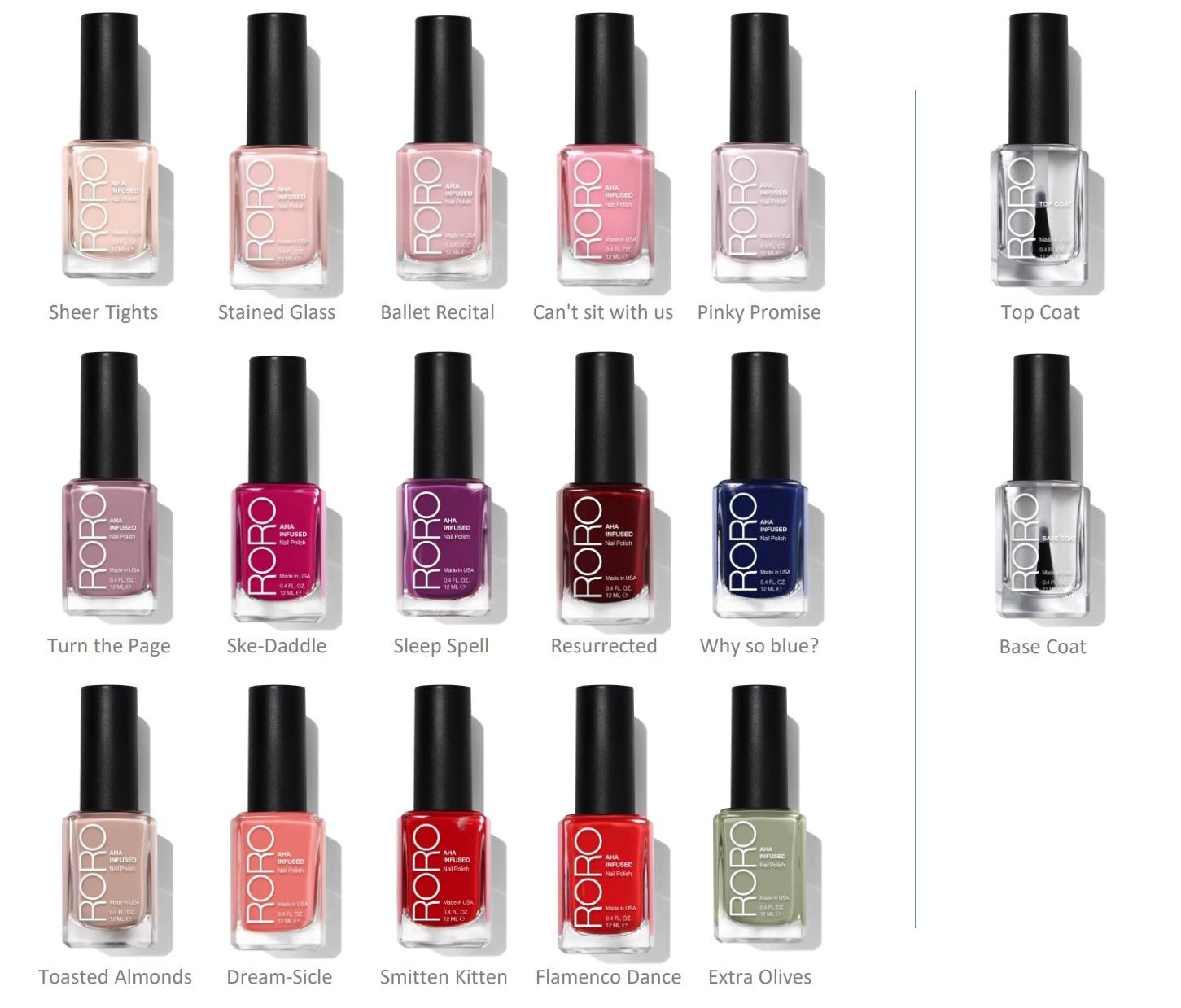 RORO was created to exceed the expectations of what an affordable nail color can be. Our professional grade polish is formulated to condition nails and deliver beautiful high impact color. Rejuvenating, AHA infused formula works to enhance moisturization, resurface, and brighten dull or damaged nails.
